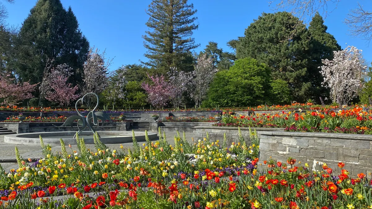 Vorhang auf für die mediterrane Pflanzenwelt der Mediterran-Terrassen: In dem weitläufigen Parkbereich mit der prächtig bepflanzten Terrassenlandschaft kann das einzigartige Panorama der Bodenseelandschaft bestaunt werden. Im Frühling können Sie hier inmitten hunderter Tulpen, Narzissen und Kaiserkronen sitzen und die warmen Sonnenstrahlen genießen. Besonders auffällig ist ein altes Exemplar einer Trompetenblume (Campsis grandiflora). Das Klettergehölz blüht ab Juli in leuchtendem Orangerot. Weitere subtropische und tropische Gewächse wie Palmen, Agaven, Schmucklilien und Bougainvillea vor einer Kulisse aus Esskastanien und verschiedenen Zypressenarten vermitteln das Gefühl, sich am Mittelmeer zu befinden. Von hier aus kann man auch den herrlichen Blick auf die Italienische Blumen-Wassertreppe und den Dahliengarten genießen. Der Schwanenbrunnen wurde 1979 anlässlich des 70. Geburtstages von Lennart Graf Bernadotte geschaffen.