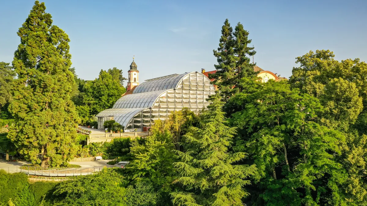 Luftaufnahme vom Palmenhaus der Insel Mainau